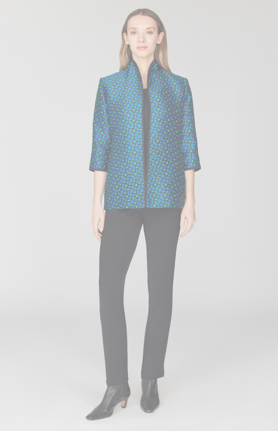 Our signature high neck jacket cut in an elegant patterned jacquard and trimmed with black Lustrous Crepe bias. This easy to wear jacket is open front with welt pockets and is finished with shoulder pads.