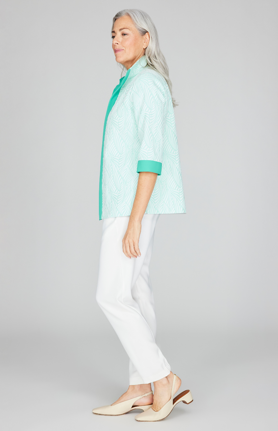 ABOUT THE FABRIC: Tonal Botanic Stretch Jacquard - A lightweight jacquard with a subtle graphic pattern, reminiscent of lush foliage. Available in three colors and always trimmed with coordinating Lustrous Crepe for effortless styling.