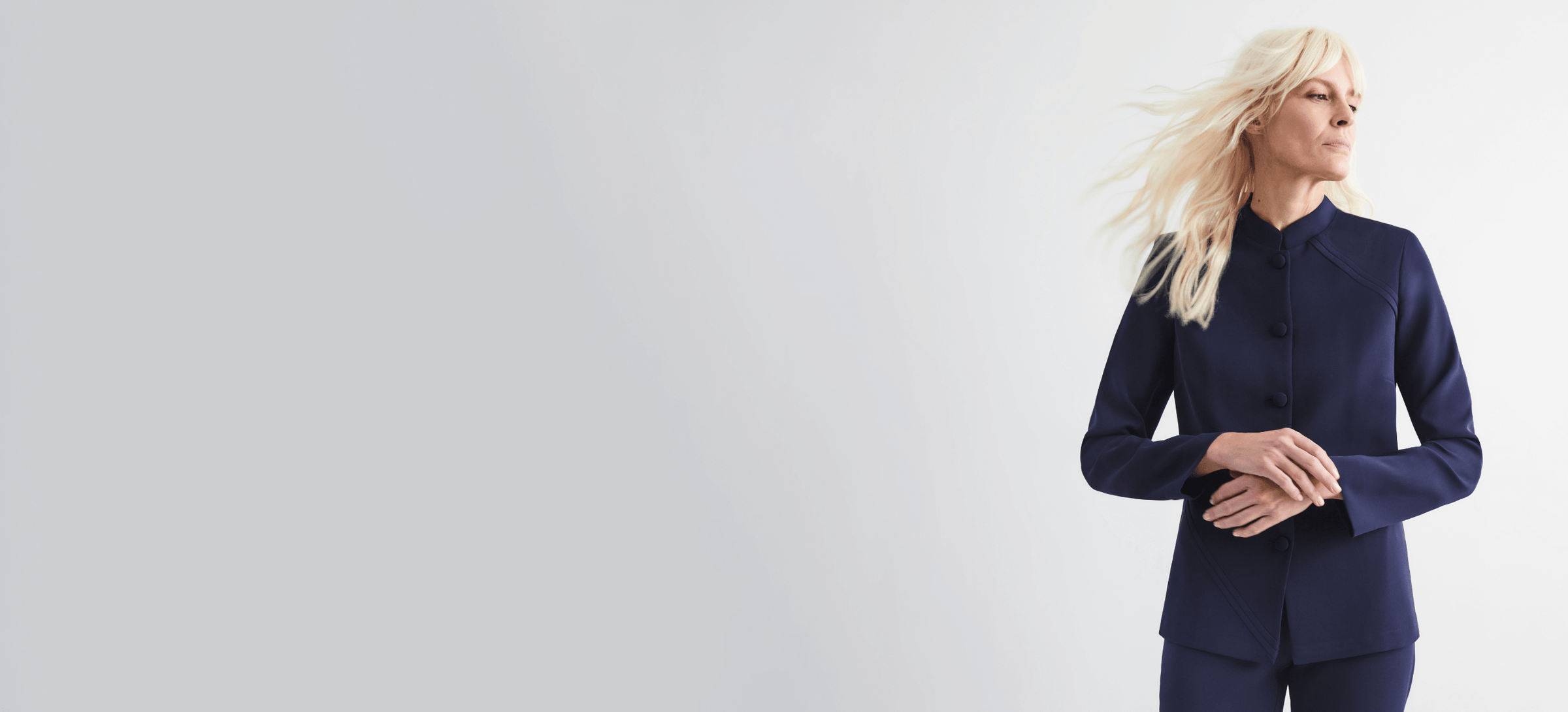 We offer an elevated assortment of dresses, separates, and essentials in this fabric and use it to trim many of our novelty fabrications to make styling easy. Mix and match your favorite essentials and underpinnings in colors that coordinate with the trim of your novelty jackets and tops to maximize wardrobing possibilities.